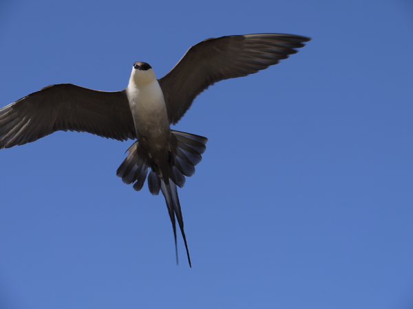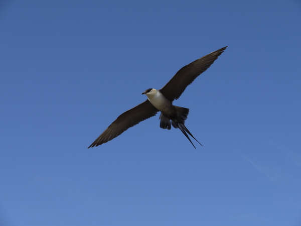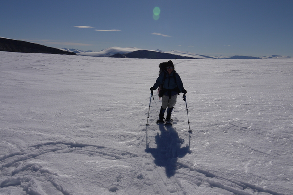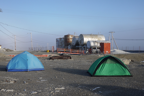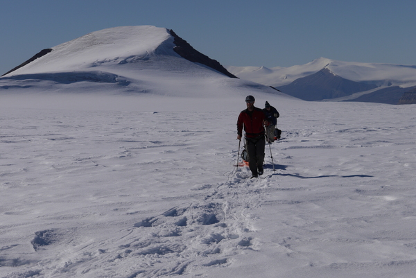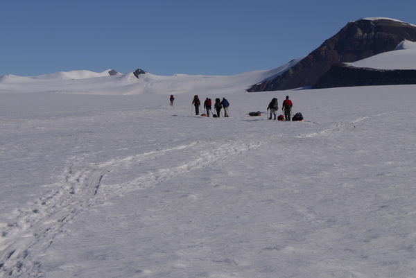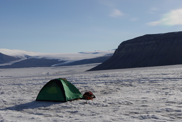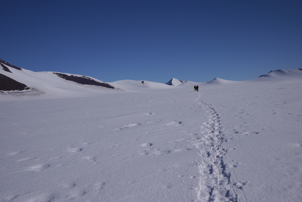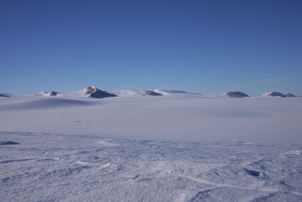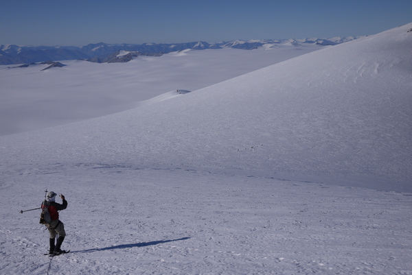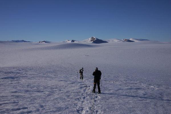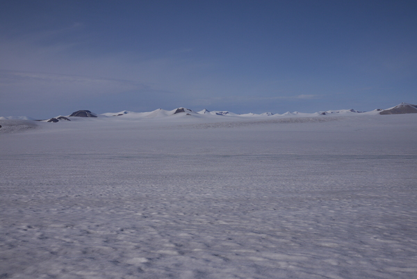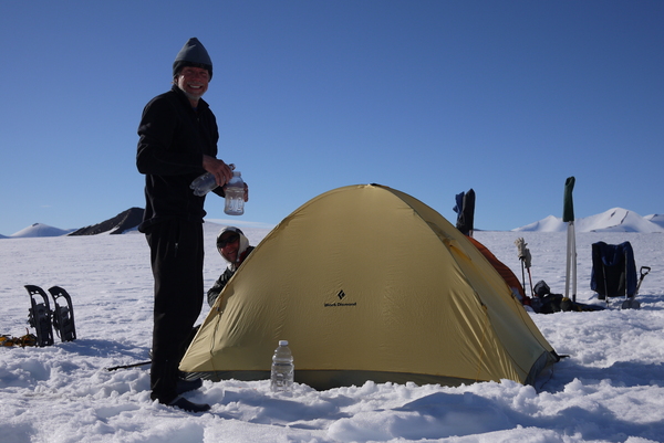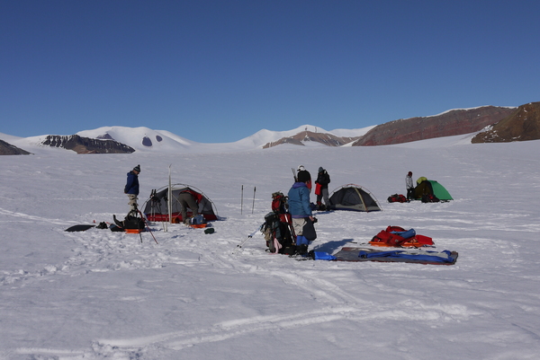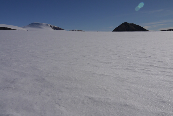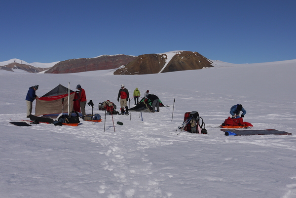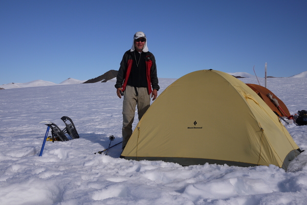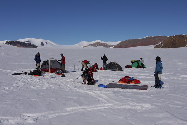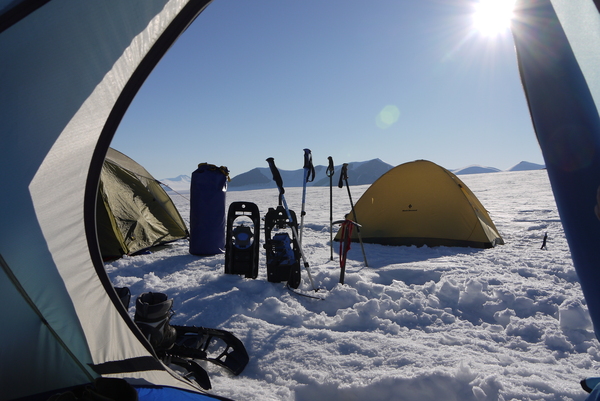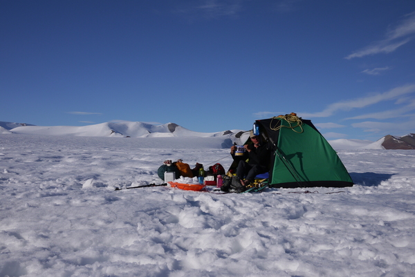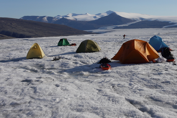 Looking back at our camp, the tiny specks on the flat snow expanse