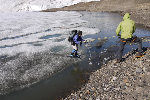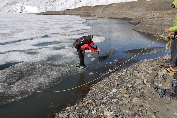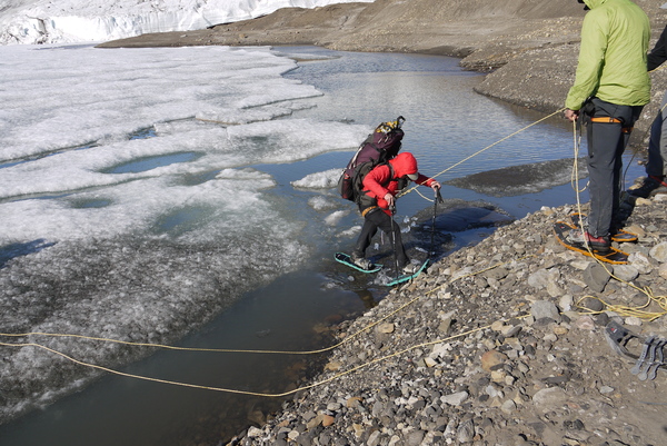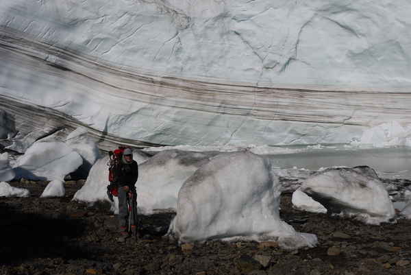 Finally, through Jack an Tom's skillful route finding, we found a route onto the glacier. We were extremely lucky, in that the lake was barely frozen near the shore. Had we been here even a week later, this route would have been impossible to reach.
