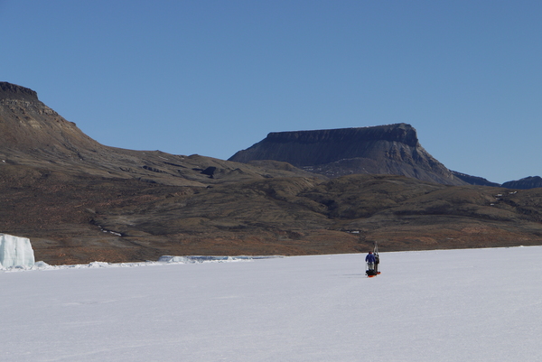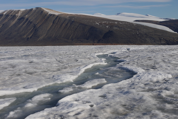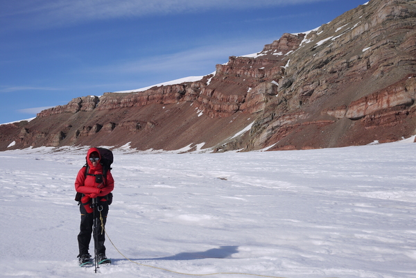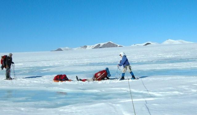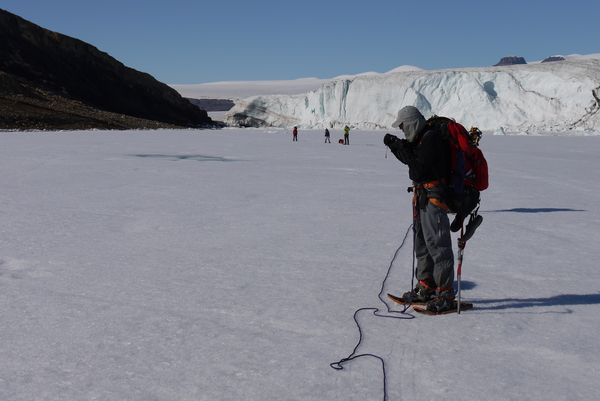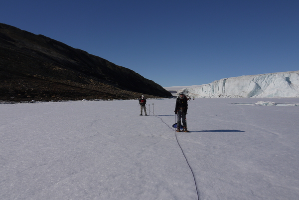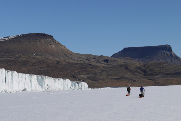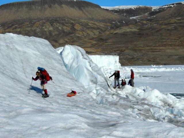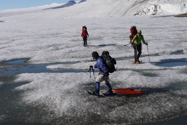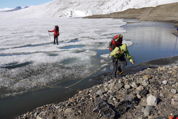Traversing a frozen lake to what we hoped would be a passage around the base of the Air Force Glacier.