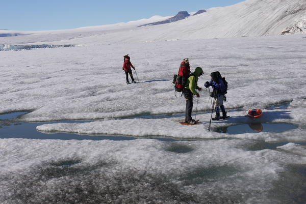 Me, trying to get my showshoe unstuck in the melting slush on the glacier.