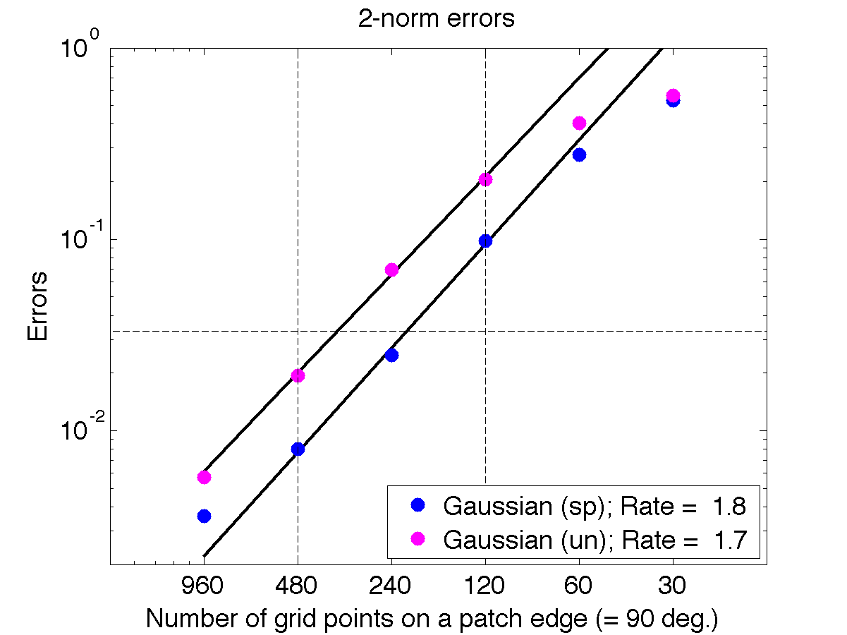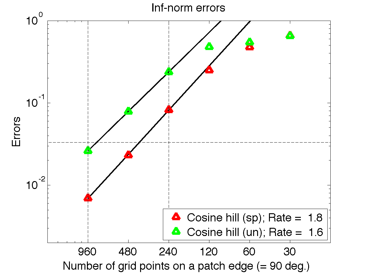 CLAW & 1.5$^\circ$ & 1.0 & 6.87$\times 10^{-3}$ & 2.89$\times 10^{-4}$ & 7.60$\times 10^{-3}$ & 6.15$\times 10^{-3}$ & 2.78$\times 10^{-6}$ & 3.59$\times 10^{-5}$\\ % CLAW & 0.75$^\circ$ & 1.0 & 3.22$\times 10^{-3}$ & 5.28$\times 10^{-4}$ & 4.89$\times 10^{-4}$ & 2.31$\times 10^{-3}$ & 5.52$\times 10^{-6}$ & 3.53$\times 10^{-5}$\\ % CLAW & 0.1875$^ \circ$ & 1.0 & 4.58$\times 10^ {-4}$ & 2.73$\times 10^ {-4}$ & 4.74$\times 10^ {-4}$ & -- & -- & -- \\ % CLAW & 0.28125$^\circ$ & 1.0 & -- & -- & -- & 3.40$\times 10^ {-4}$ & 1.27$\times 10^ {-4}$ & 1.92$\times 10^ {-5}$\\