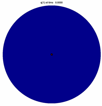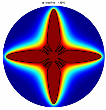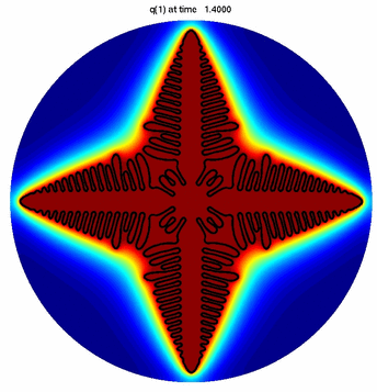 This is an example of a system of coupled parabolic equations that form the phasefield system used to model the growth of dendrites from a pure melt. The single black contour line is the phase boundary, or interface between the super-cooled liquid and solid. The shaded contour lines are show the temperature field, with blue being the coldest and red the warmest. In this case, the crystal growth is driven by a combination of temperature gradient and interface curvature.